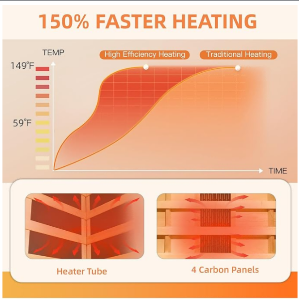 【Ефективна технология за отопление】 Содена с 4 въглеродни панела и 1 въглеродна тръба, нашата 1 човек инфрачервена сауна осигурява 360-градусово отопление на съраунд, като гарантира равномерно разпределение на топлина. Обикновено тя се загрява само за 10-15 минути, което ви позволява да се наслаждавате на изживяването на сауната си без забавяне.