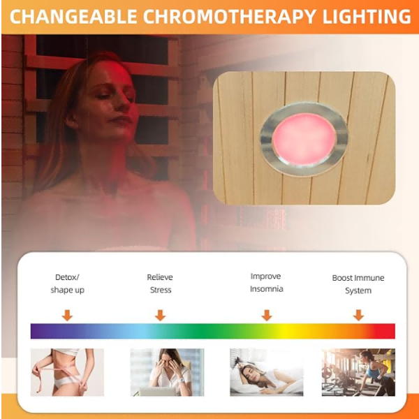 【Подобрена релаксация】 Нашите инфрачервени сауни за дома разполагат с покрив, осветен със 7 цветна терапия, създавайки потапяща атмосфера, за да подобрите цялостното ви изживяване. Лесно се инсталира във вашия мазе, баня или фитнес и с Bluetooth свързаност и кислородна лента, можете да се насладите на релаксираща сесия на сауна