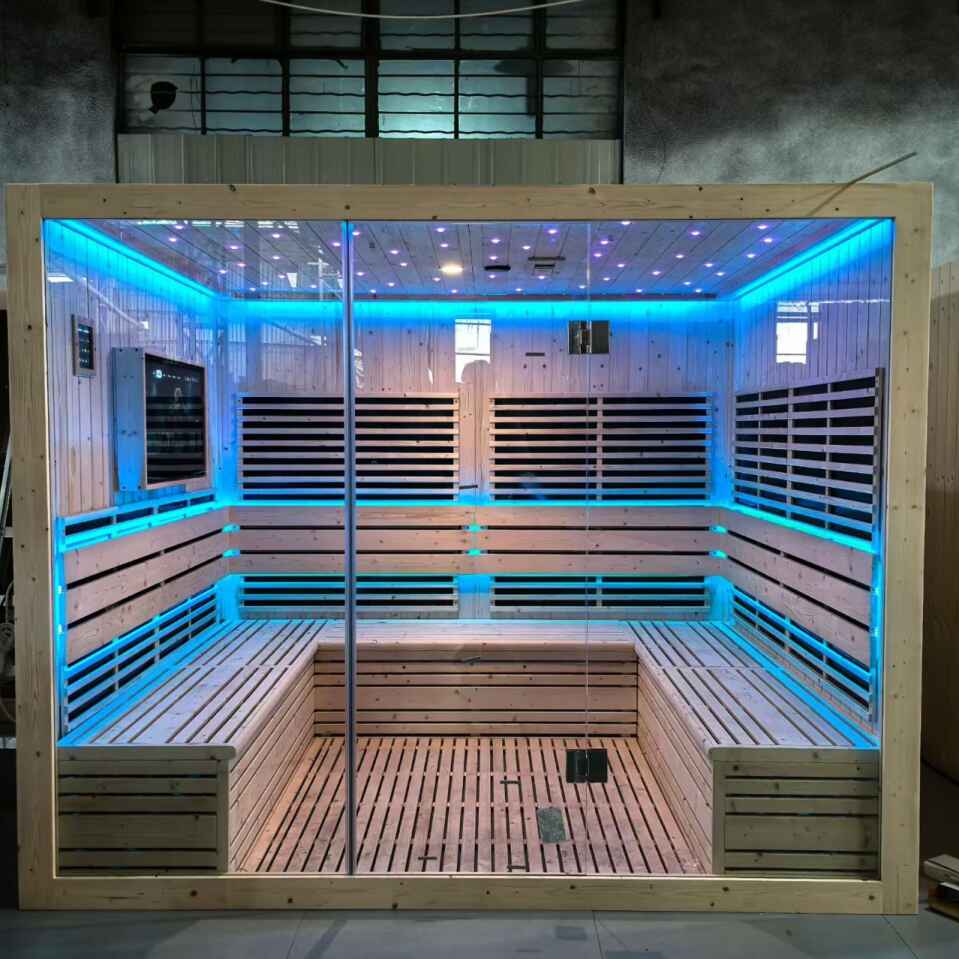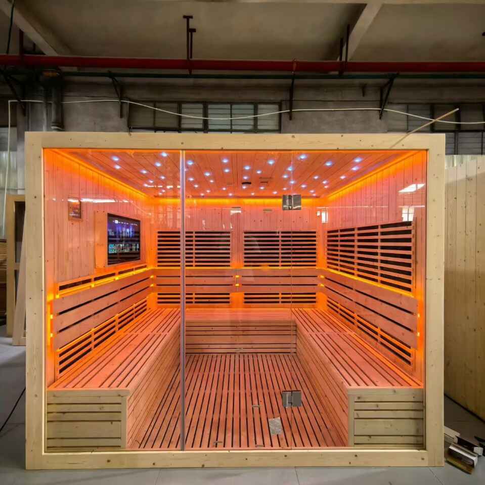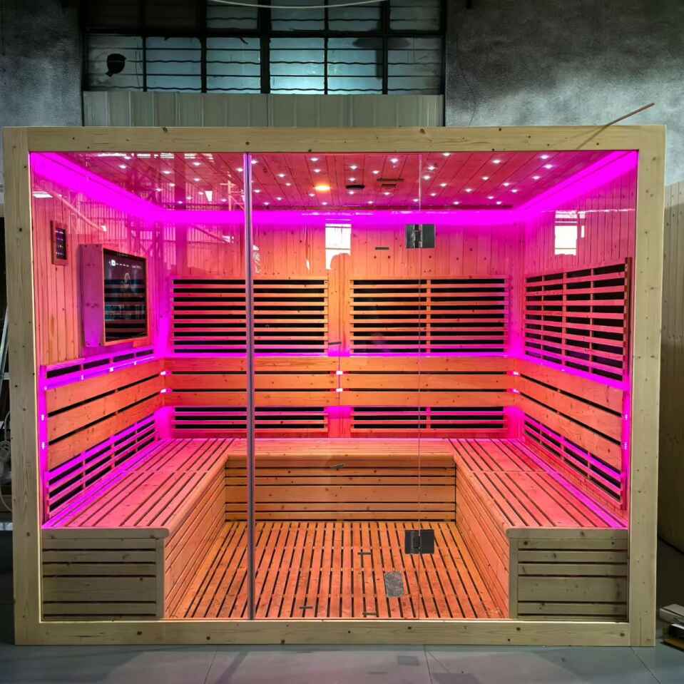 Търсите просторно и луксозно решение за сауна за групова релаксация, общуване или търговска употреба? Нашата сауна за 5-10 души с далечна инфрачервена сауна с дървена сауна и LCD телевизор е съобразена да отговори на вашите нужди, интегрирайки първокласни материали, усъвършенствана технология и ориентиран към човека дизайн.