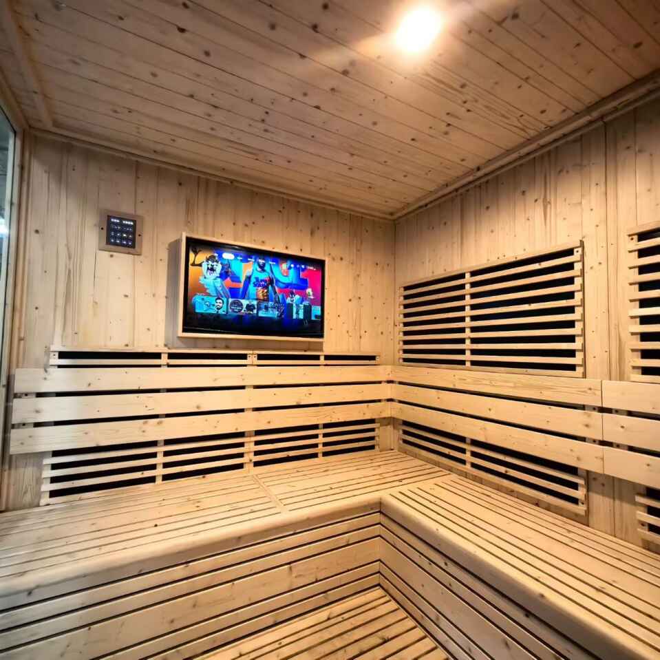 Вграденият LCD телевизор (вижда се на изображението) трансформира изживяването в сауната: