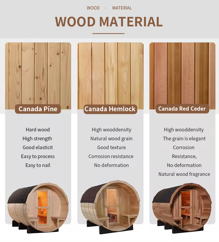 Персонализиране на дърво: Избира висококачествено внесено от Канада дърво, специфично за открито – бор (висока твърдост, рентабилен, антикорозионно обработен), бучиниш (висока плътност, устойчивост на влага и деформация) и западен червен кедър (естествено антикорозионен, с естествен аромат на дърво, силна издръжливост на открито), отговарящи на изискванията за устойчивост на атмосферни влияния на различни външни среди заВъншна стъклена врата външна парна баня.