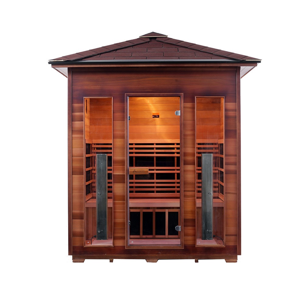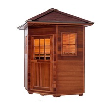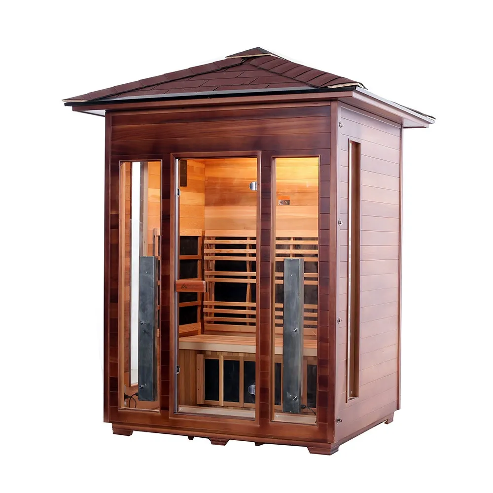 Тази външна сауна е изработена от канадски западен червен кедър или канадски бучиниш. Дървото може да се похвали с устойчивост на корозия и влага, както и структурна стабилност. Оборудван с далечна инфрачервена технология за нагряване от въглеродни влакна, той се загрява бързо и разпределя топлината равномерно. Подходящ за външни среди като дворове, балкони, вилни градини, зони край басейни и курорти.