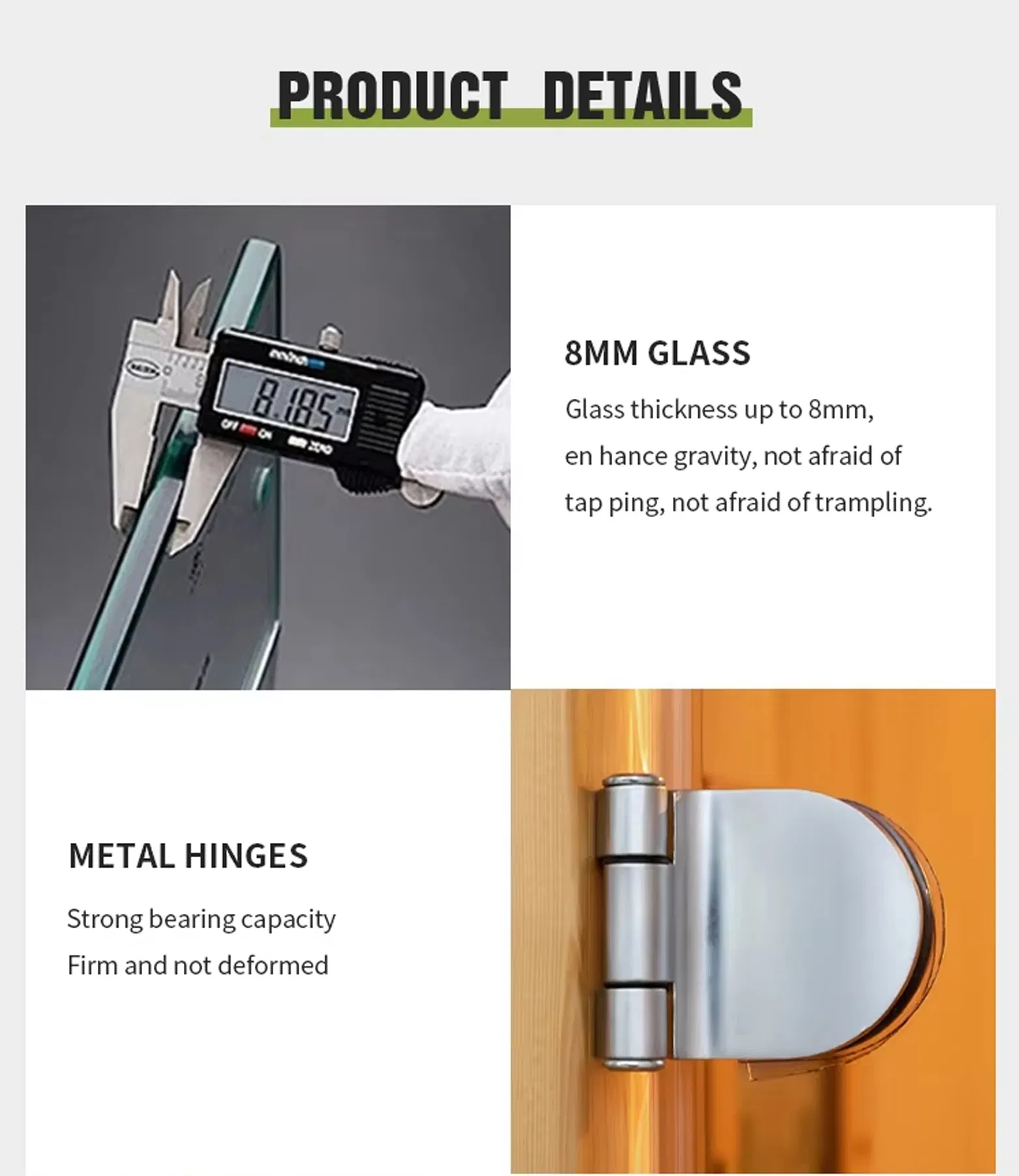 - Устойчиви метални панти – Панти от неръждаема стомана с товароносимост от 100 кг, гарантиращи, че вратата ви ще остане подравнена с години.